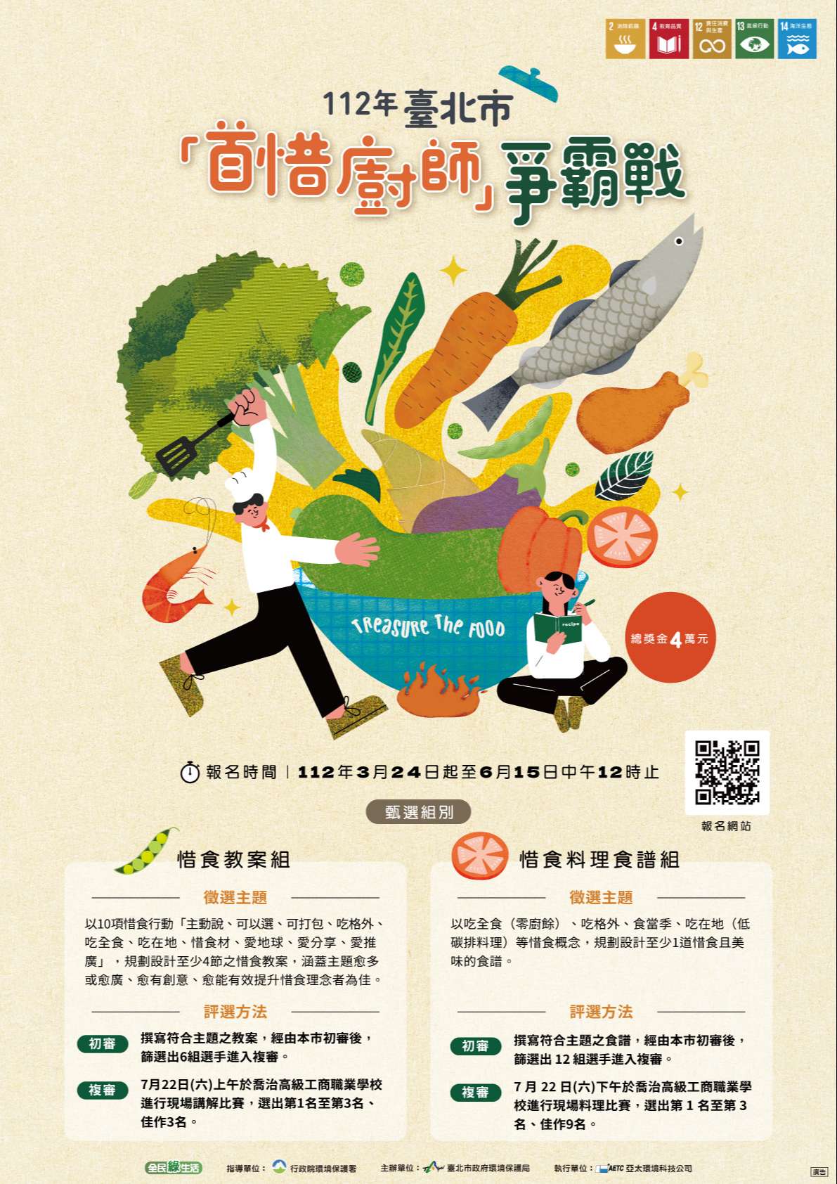 一、為呼應聯合國於2030年前零售及消費者減少50%食物浪費的永續發展目標,儘可能發揮食材價值的最大化,本局將辦 理112年臺北市「首惜廚師」爭霸戰,於3月24日(五)至6 月15日(四)中午12時止開放報名,競賽分為「惜食料理食譜組」及「惜食教案組」,各組前3名除可獲得獎金外, 各組第1名將代表北市參加環保署辦理之全國賽。本次「首惜廚師」甄選活動分為初審及複審2階段進行,初審訂於7 月上旬進行書面評審,並於7月7日(五)於臺北市環境保 護局官網及「臺北市無圍牆環境教育博物館網站」公布入選者,複審將於7月22日(六)於北市喬治高級工商職業學校進行,透過實作方式選出優勝者,本競賽複審簡述如 下: