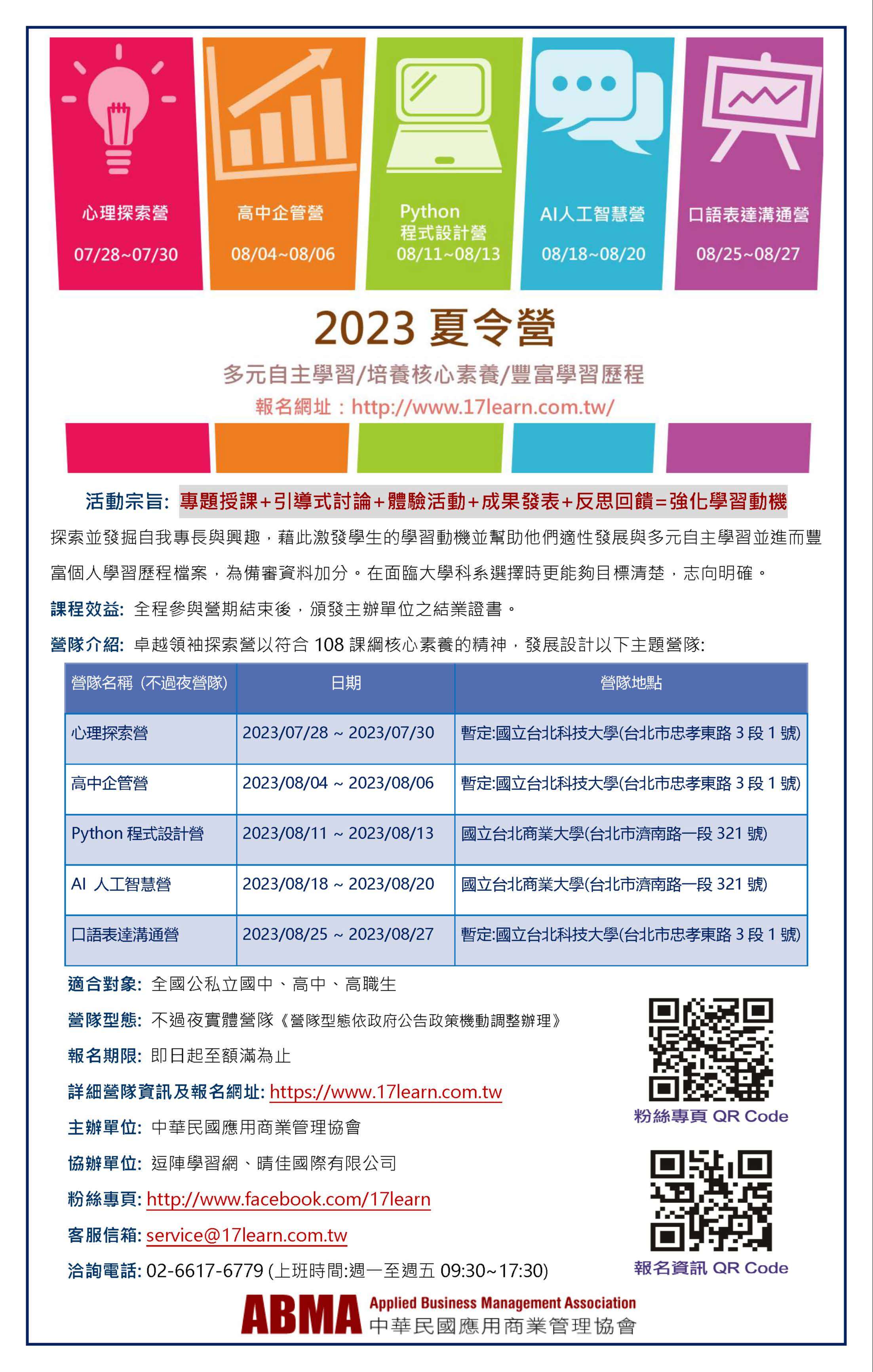 營隊訊息及報名網址: http://www.17learn.com.tw