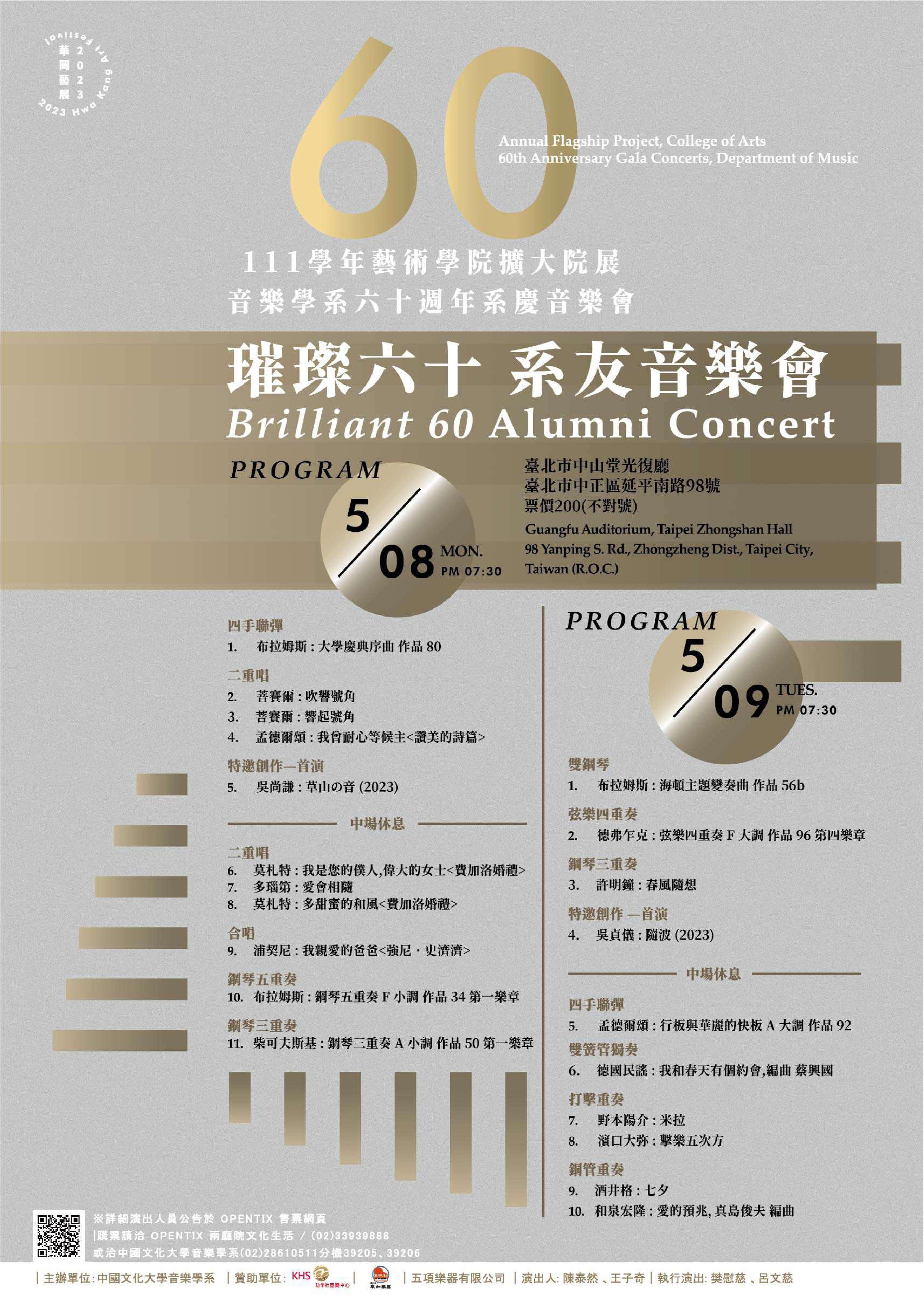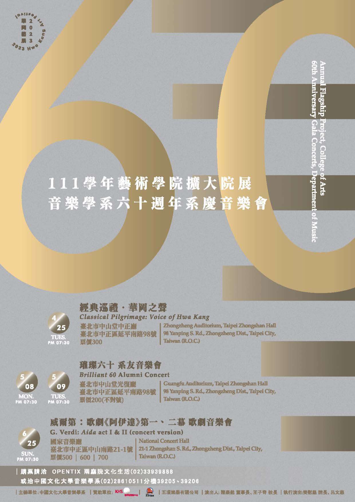 111學年度中國文化大學藝術學院院展暨音樂學系六十週年系慶音樂會,請惠轉校內師生蒞臨聆賞。