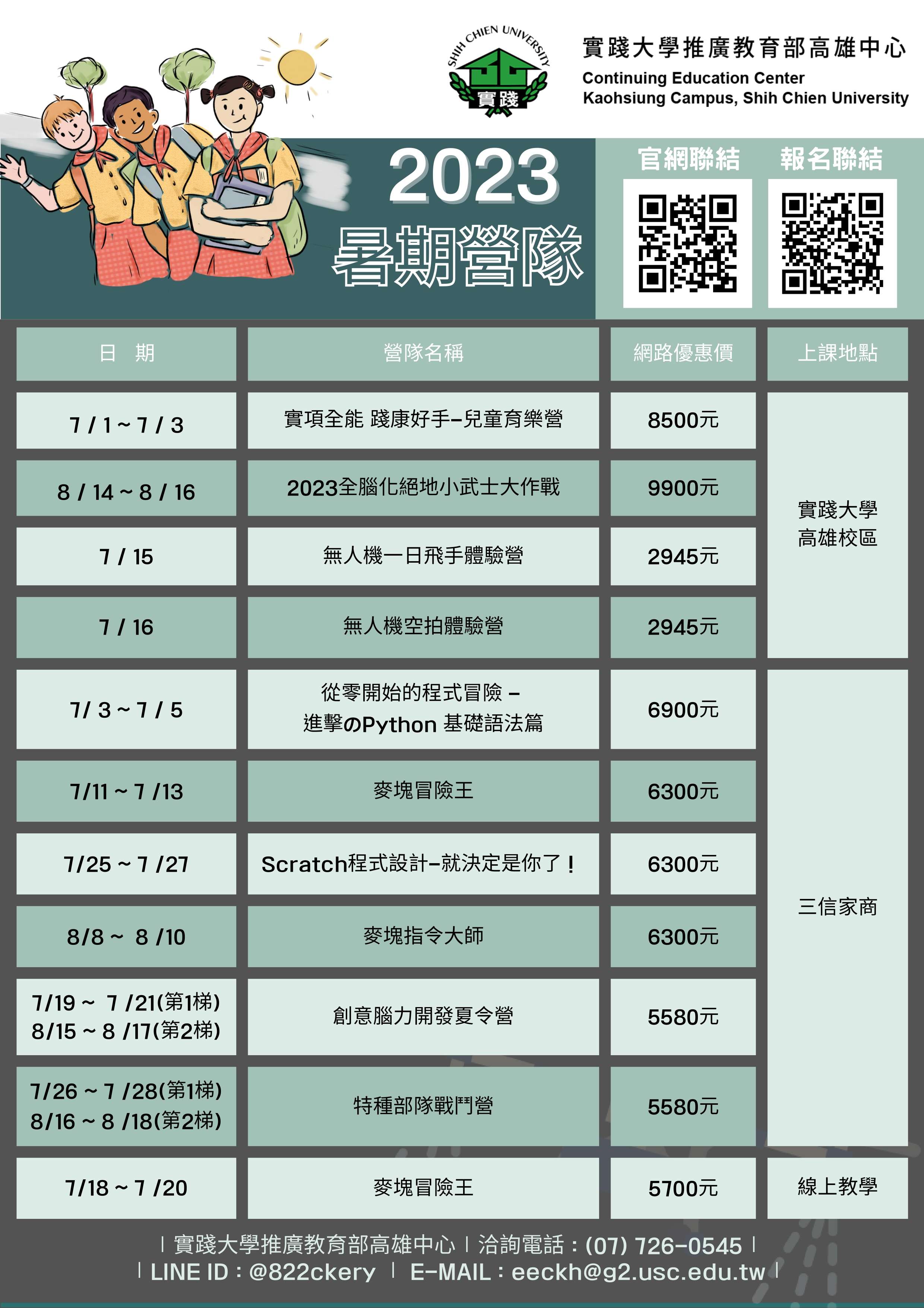 實踐大學推廣教育部高雄中心開設暑假營隊活動訊息,請 查照並惠予公告及轉知所屬相關人員。