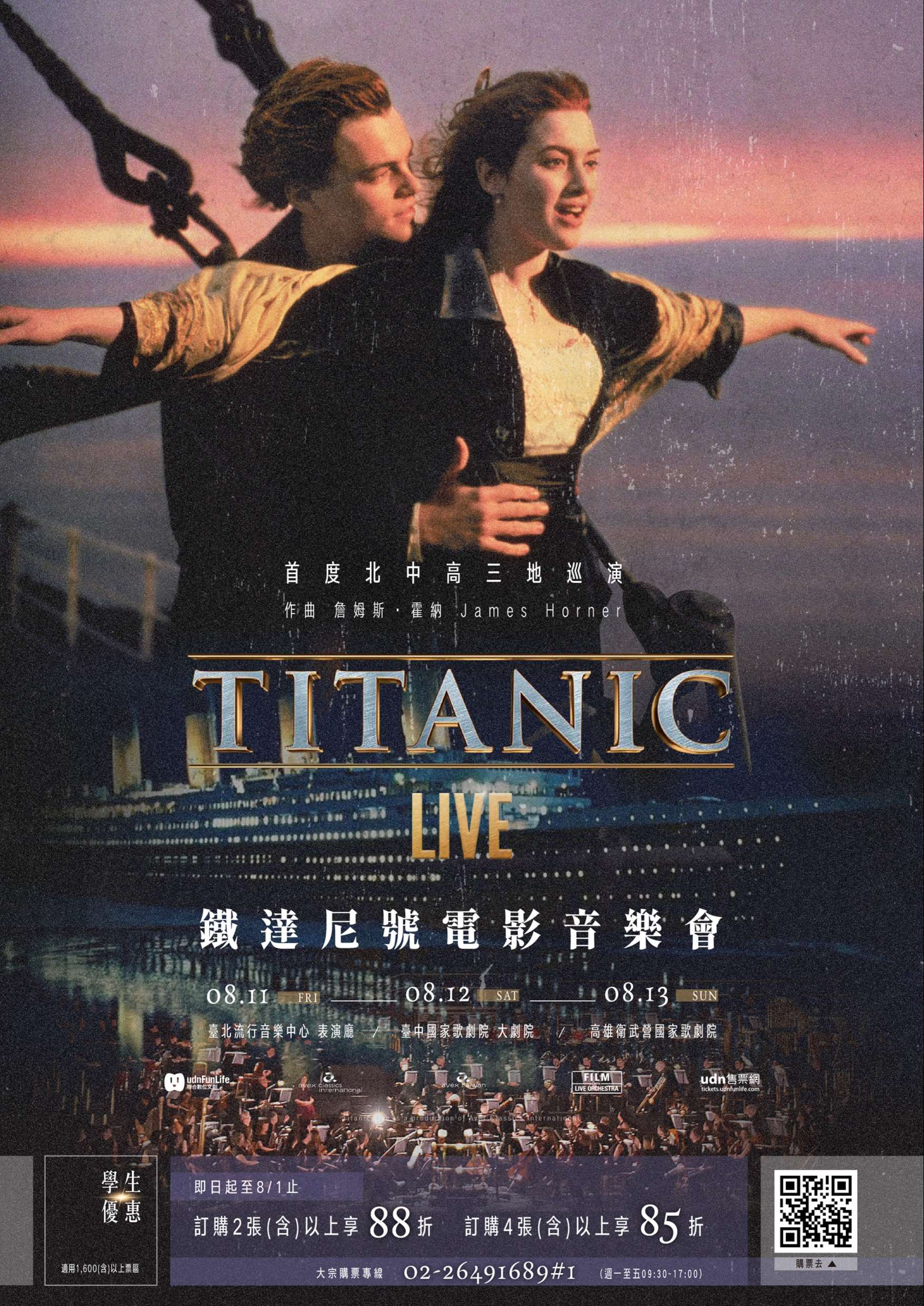 (二)節目介紹:跨越世代的經典電影《鐵達尼號》耗資上億 美元,是當時最昂貴的電影,為了真實還原歷史,導演詹姆斯.卡麥隆 (James Cameron) 特地打造了1:1的模 型拍攝,同時採用最先進的電腦動畫技術,讓觀眾身歷 其境地參與歷史事件之中。上映總票房就超過18.4億美 元,是全世界首部突破10億美元大關的電影,盤據全球 影史賣座排行榜冠軍長達12年,目前仍高居第3名。《鐵 達尼號》在該年的奧斯卡獎也大放異彩,共獲得14項提 名,最終獲得11座獎項,包括最佳影片、最佳導演、最 佳攝影、最佳視覺效果、最佳原創音樂、最佳原創歌曲 等,同時還創下10項金氏世界紀錄:成本最高電影、票 房最高的劇情片等,在全球影史上的地位難以取代。 《鐵達尼號》配樂由傳奇好萊塢電影作曲家詹姆斯.霍 納James Horner一手打造,除獲得奧斯卡肯定外,亦獲 得3座葛萊美獎,並被認證為史上最暢銷的電影配樂專輯。由席琳狄翁 (Celine Dion) 演唱的主題曲〈My Heart Will Go On〉更是傳唱大街小巷,是音樂史上最 暢銷單曲之一,在全球超過二十國排行榜登上冠軍。今 年8月將以超過百人的管絃樂團及合唱團編制現場演出,讓觀眾有如身歷其境的感受,當樂音響起時,與傑克和 蘿絲共同出航,體驗這具有歷史意義以及淒美愛情的航 行。演出時間預計215分鐘,含中場休息20分鐘。