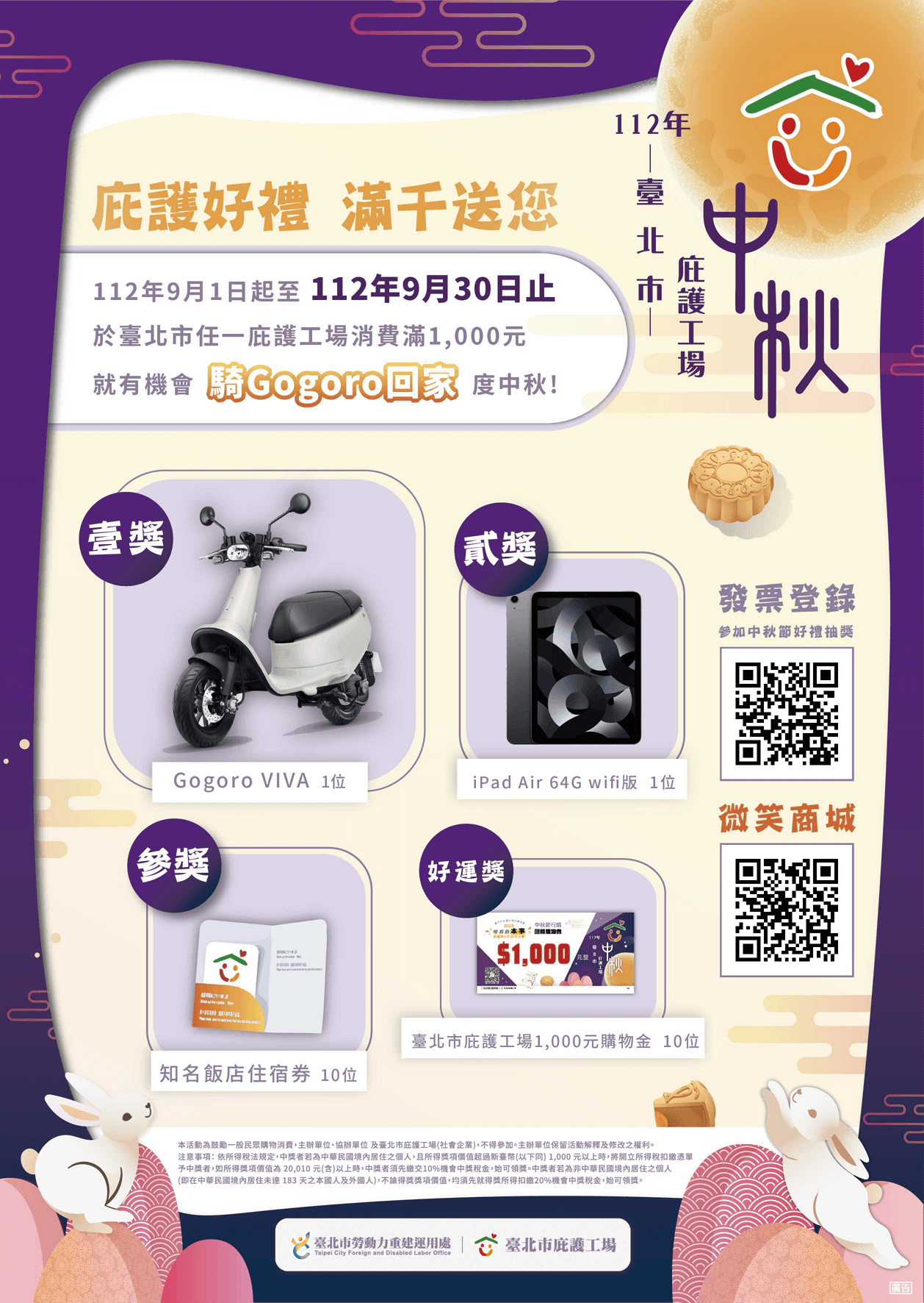 中秋佳節即將來臨,為推廣庇護工場產品,以消費零距離為主軸,打造24小時不打烊入口網站「微笑商城」,並且推出滿千抽Gogoro活動,歡迎各界選購,支持身心障礙者就業。