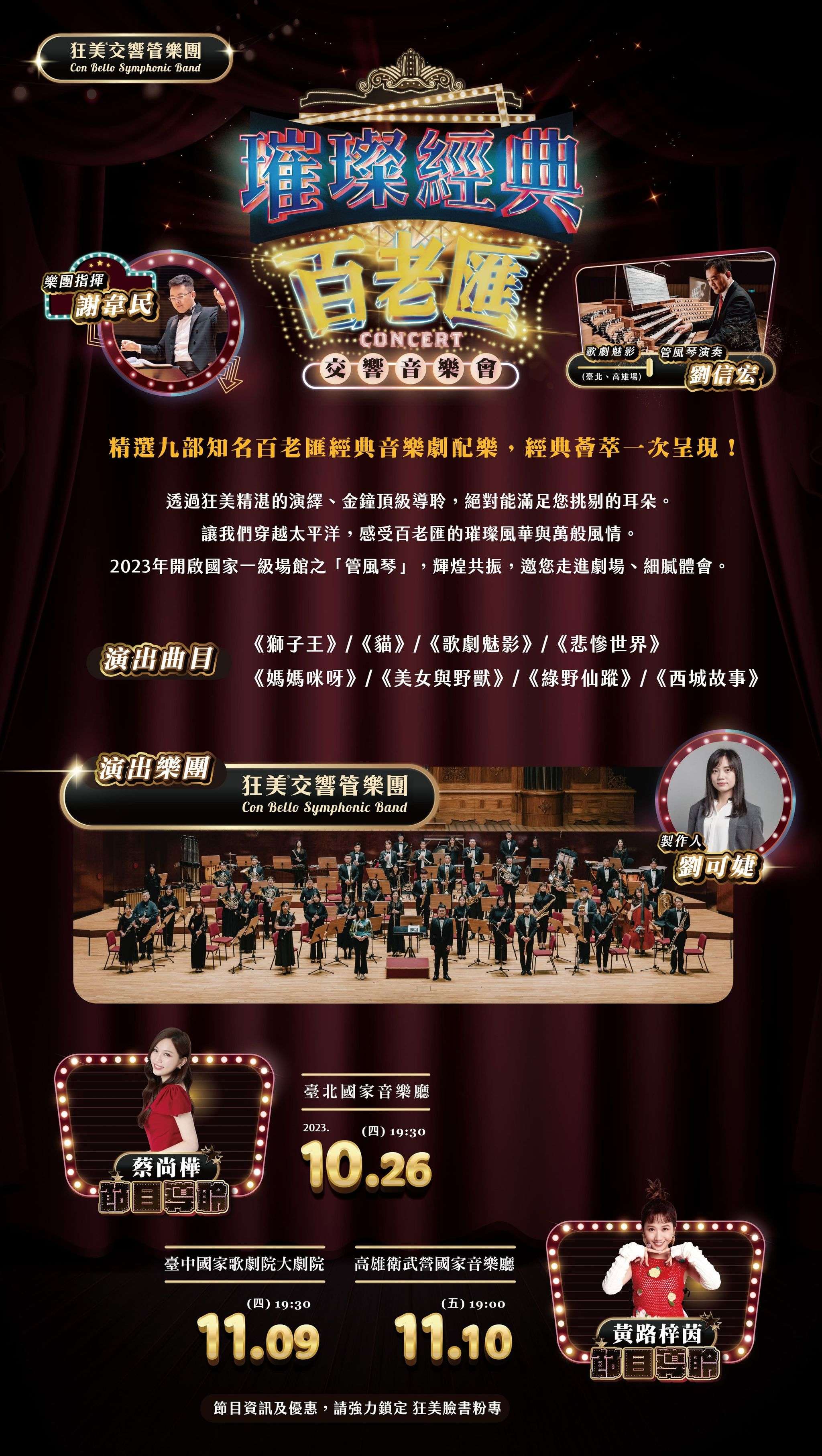 說明: 一、節目介紹:精選九部百老匯經典音樂劇配樂,網羅歌劇魅 影、悲慘世界、媽媽咪呀、貓、美女與野獸、獅子王、綠 野仙蹤、西城故事...等知名劇碼,經典薈萃一次呈現!經 由狂美精湛的演繹、金鐘導聆,絕對能滿足您挑剔的耳 朵!讓我們穿越太平洋,感受百老匯的璀璨風華與萬般風 情。 二、演出時間及地點: (一)臺北-國家音樂廳 2023/10/26(四)19:30 (二)臺中-臺中國家歌劇院大劇院 2023/11/09(四)19:30 (三)高雄-衛武營國家音樂廳 2023/11/10(五)19:00 三、免費加入愛樂之友即可取得教育推廣75折購票優惠: https://line.me/R/ti/p/%40conbello2017
