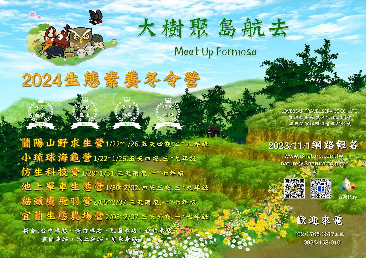 四、提醒各位師長與家長:①依我國法令規定,辦理外出營隊 與過夜營隊,招生單位需自有旅行社執照,不可向他人靠 行或向外縣市旅行社借牌,才是合法有保障的營隊。②愛 上大自然文教合法開立統一發票給每位學員家長,不以 「非營利協會」包裝公司營利行為。③「愛上大自然文 教」與「愛上大白熊旅行社」合法登記,兩單位共同經 營,課程皆為學員.講師.助教,投保足額南山人壽平安保 險,讓您安心放心。