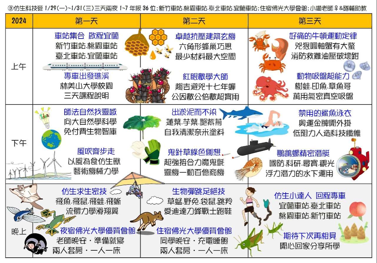 二、六種課程主題為:①蘭陽山野求生營(5天4夜)、②小琉球 海龜營(5天4夜)、③仿生科技營(3天2夜)、④貓頭鷹飛羽 營(4天3夜)、⑤池上單車生態營(4天3夜)、⑥宜蘭生態農 場營(3天2夜)。
