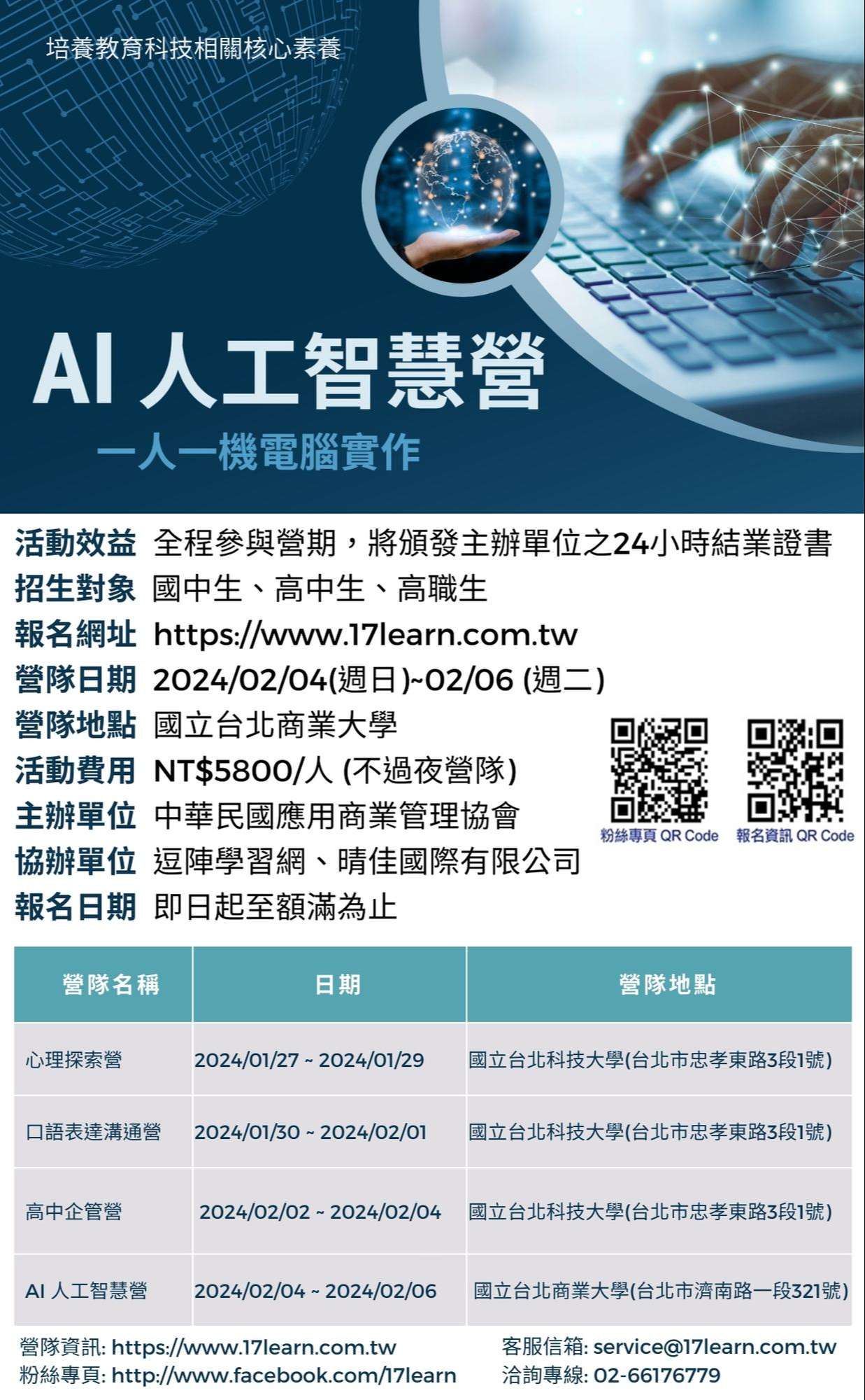 說明:隨著ChatGPT、Midjourney的推出,正式宣告人工智慧(AI) 時代來襲,將為世界帶來顛覆性變革。因應這樣的巨大科 技浪潮,教育部自2020年起AI課程納入基礎教育,推動從 國小、國中到高中的AI教育;透過跨部會整合及推動「台 灣AI行動計畫」,盼將台灣打造成全球AI人才重鎮。透過 三天營期,讓學生對於科技發展大浪潮有初步的了解與體 認。