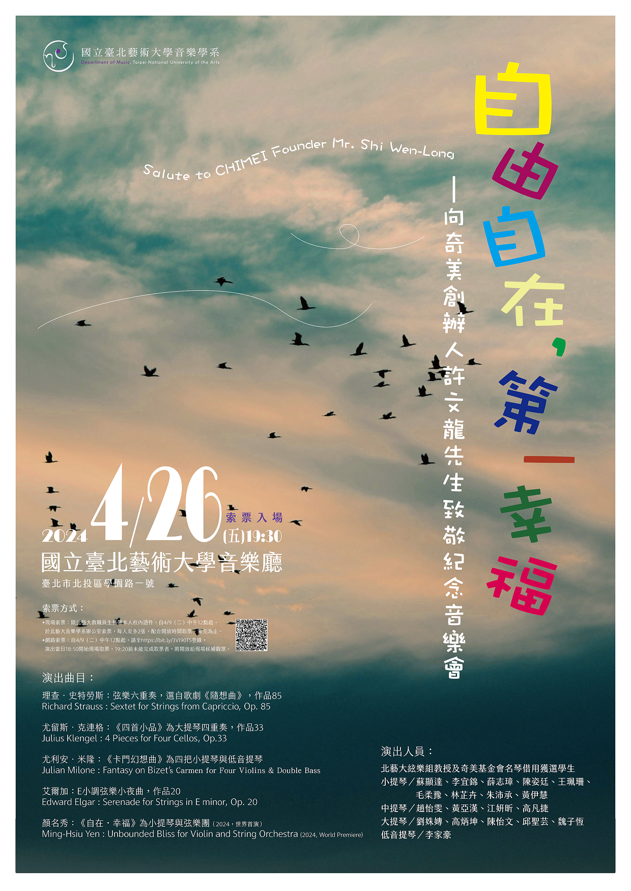 國立臺北藝術大學音樂學系辦理「自由自在,第一幸福―向奇美 創辦人許文龍先生致敬紀念音樂會」