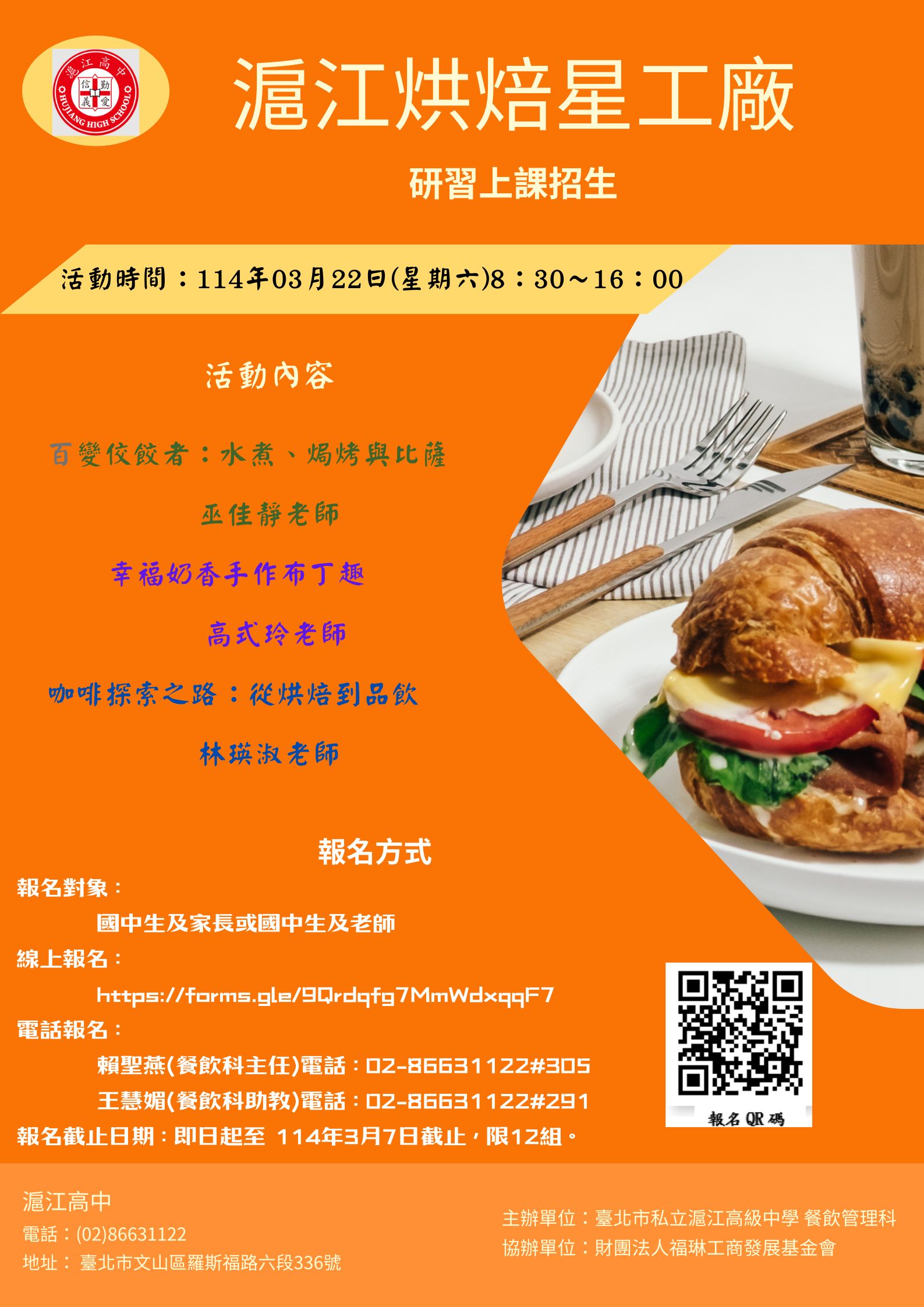一、轉知滬江高中3/22辦理餐飲管理科「滬江烘焙星工廠」研習活動,歡迎本校 學生及家長 或 學生及老師 報名參加。