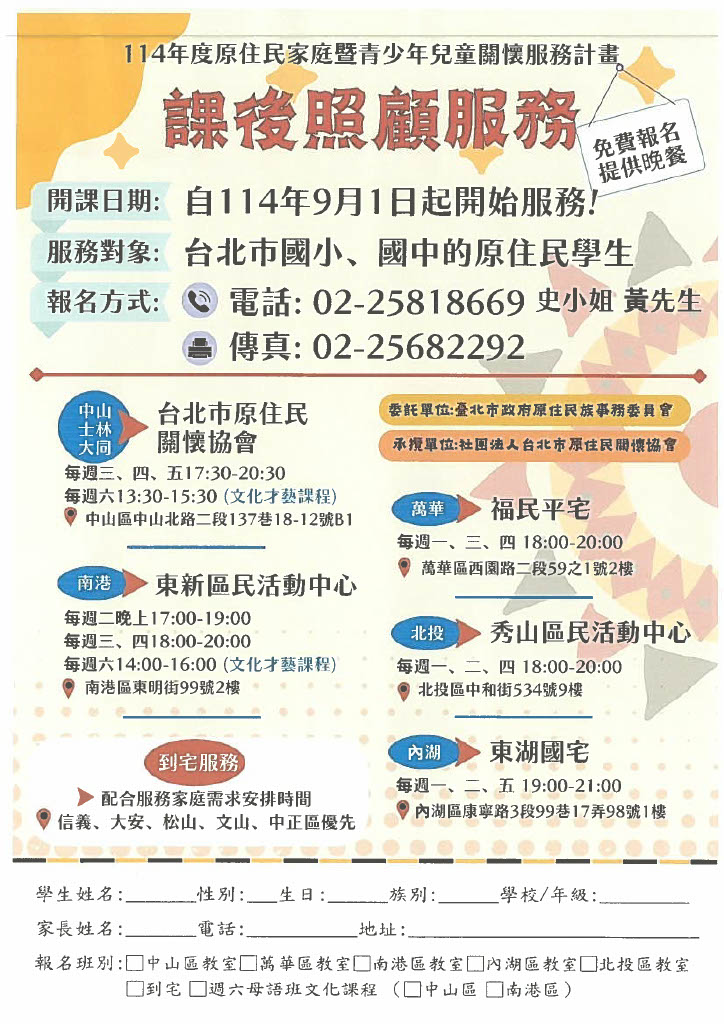轉知臺北市政府原住民族事務委員會委託社團法人台北市原住民關懷協會辦理「114年原住民家庭暨青少年兒童關懷服務計畫-課後照顧服務」,歡迎本校原住民學生報名參加,詳見來函及附件海報說明。