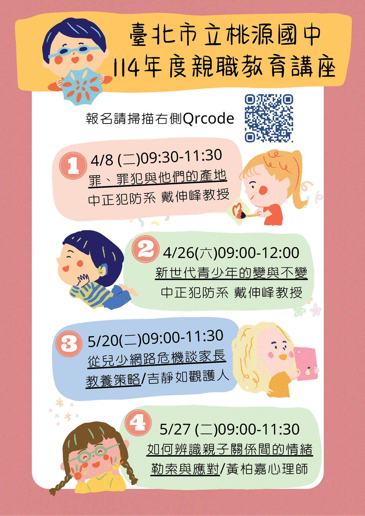 一、本校114年度親職教育講座場次如下: