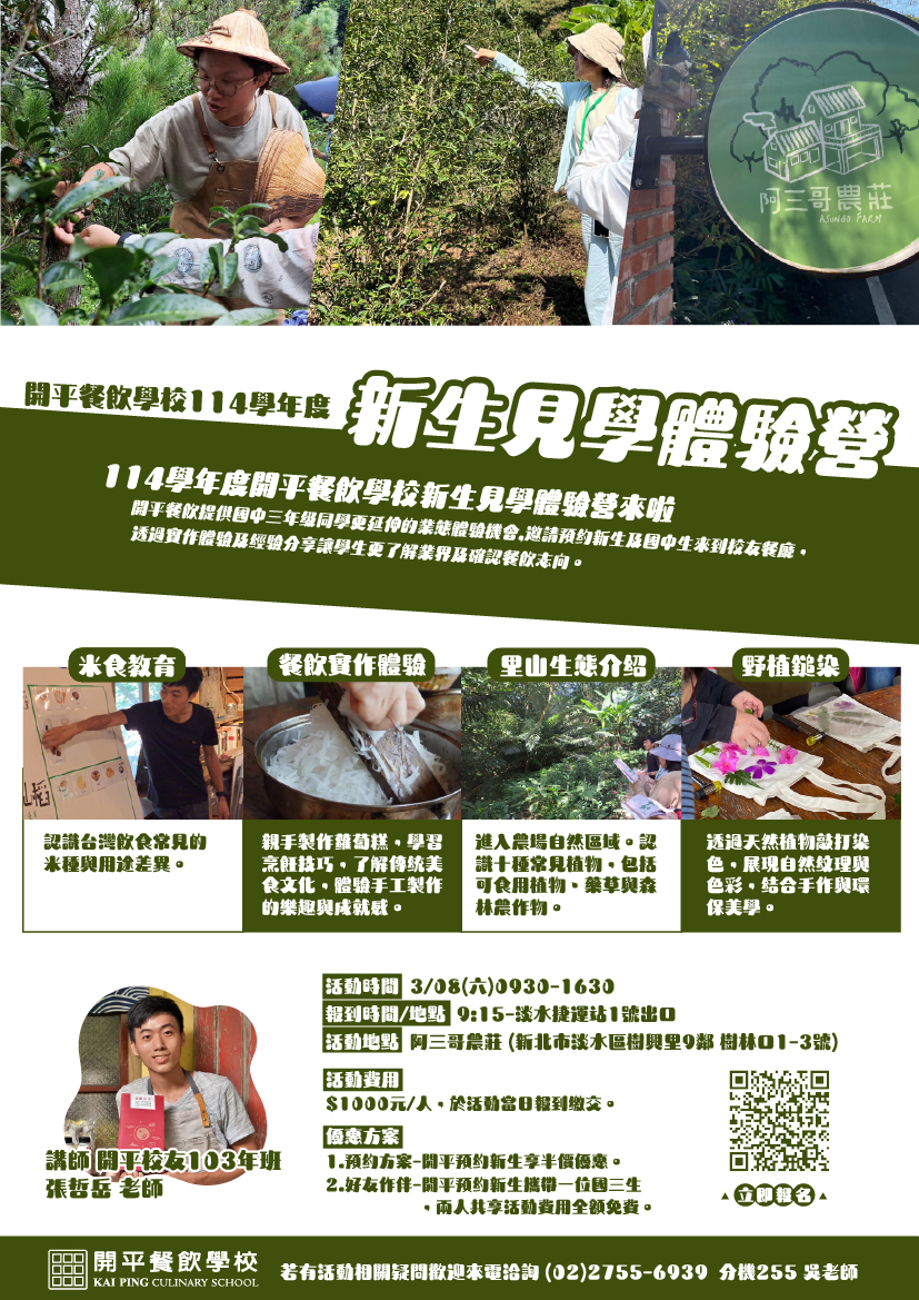 一、轉知開平餐飲職業學校辦理「開平餐飲學校113學年度新生見學營」活動。