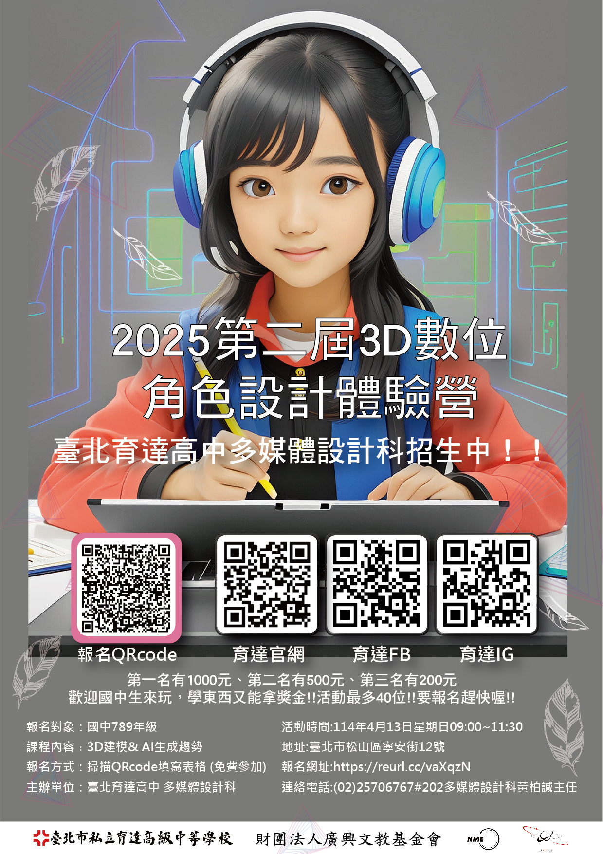 一、轉知臺北市育達高中辦理「2025第二屆3D數位遊戲角色設計體驗營」,歡迎本校有興趣的學生參加。