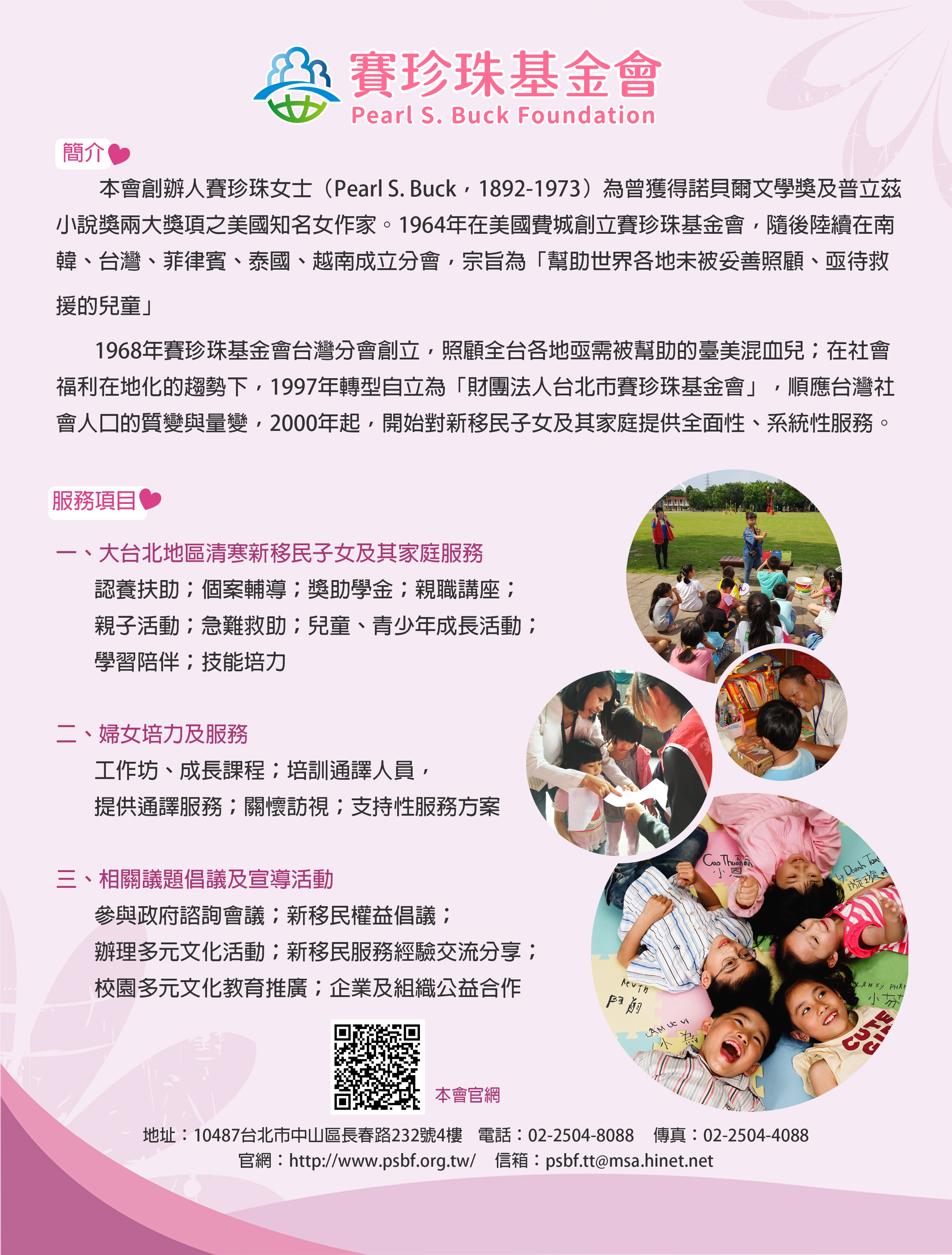 一、財團法人台灣賽珍珠社會福利基金會係於民國86年立案之社會福利組織,長期服務經濟弱勢新住民家庭,對育有18 歲以下子女之提供服務內容:助養扶助、個案輔導、獎助學金、學習陪伴、親職講座、親子活動、兒少成長活動。