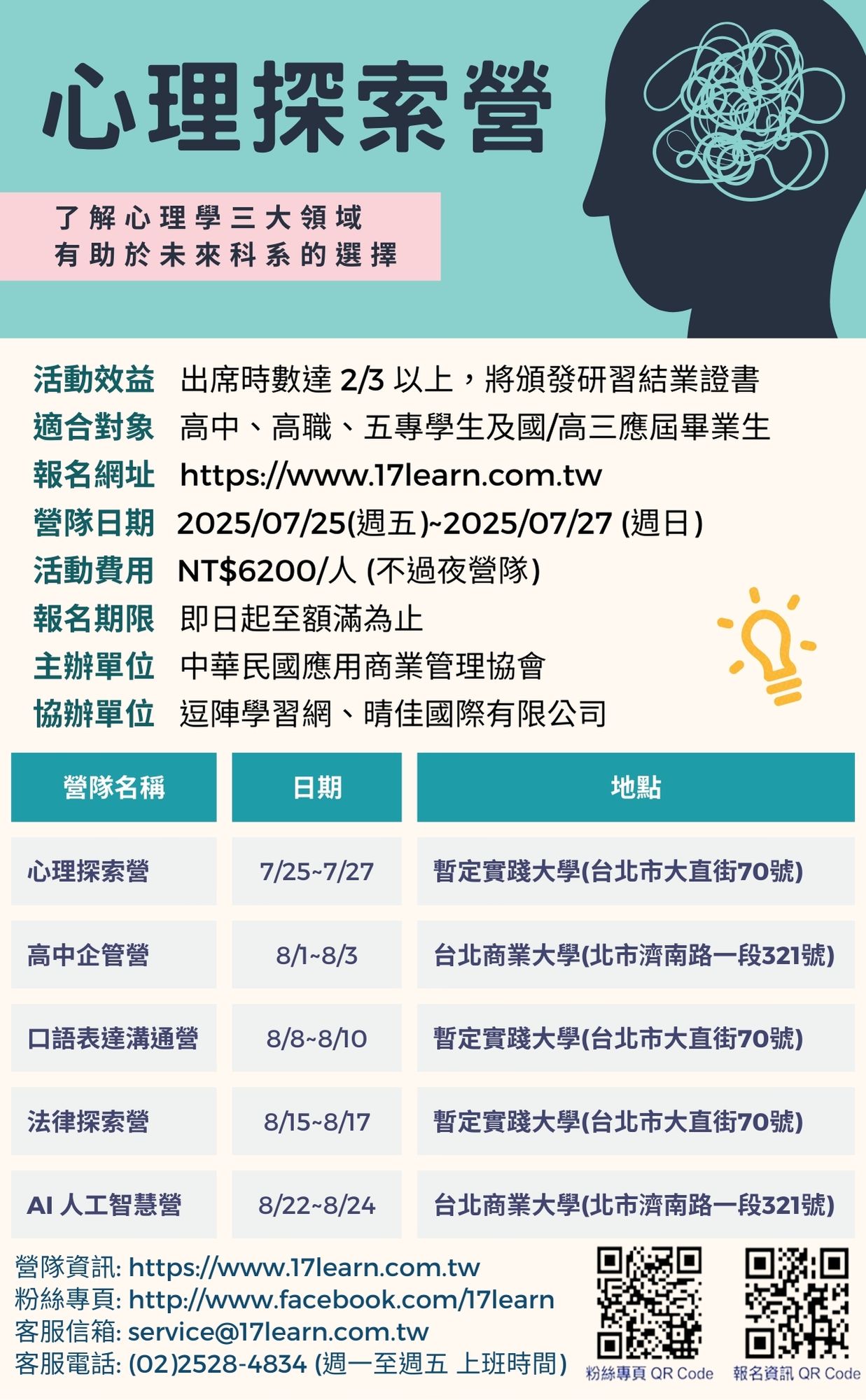 一、轉知中華民國應用商業管理協會2025/7/25-7/27辦理心理探索營-2025夏令營。