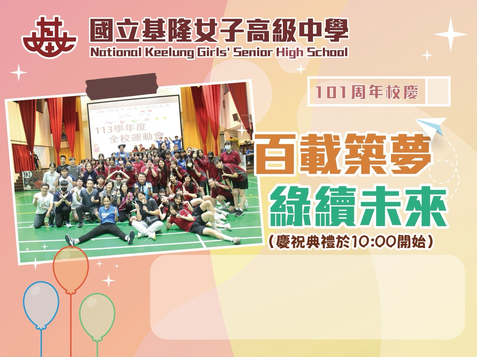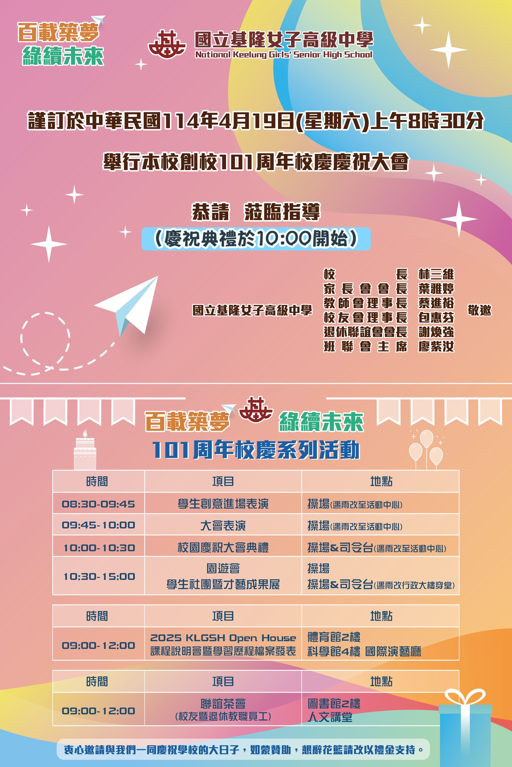 一、轉知國立基隆女子高級中學(以下簡稱國立基隆女中)訂於114年4月19日(星期六)辦理「國立基隆女中創校101周年校慶慶祝大會暨OPEN HOUSE校園開放日」,歡迎本校學生及家長蒞臨參加。