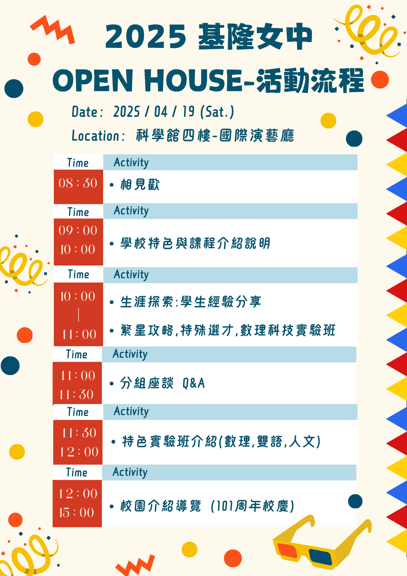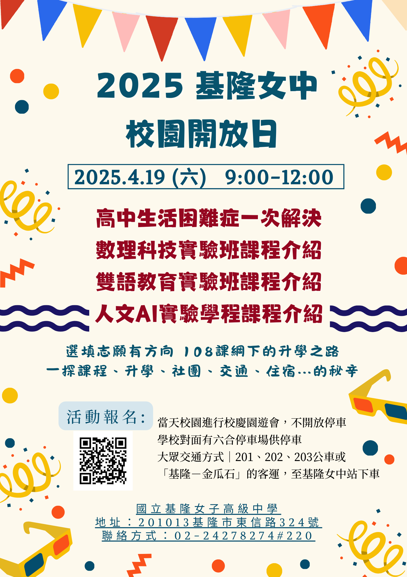 五、詳見活動海報,如有任何疑問,請洽國立基隆女中教務處註冊組楊組長,電話:(02)2427-8274分機220、221、222,電子郵件: