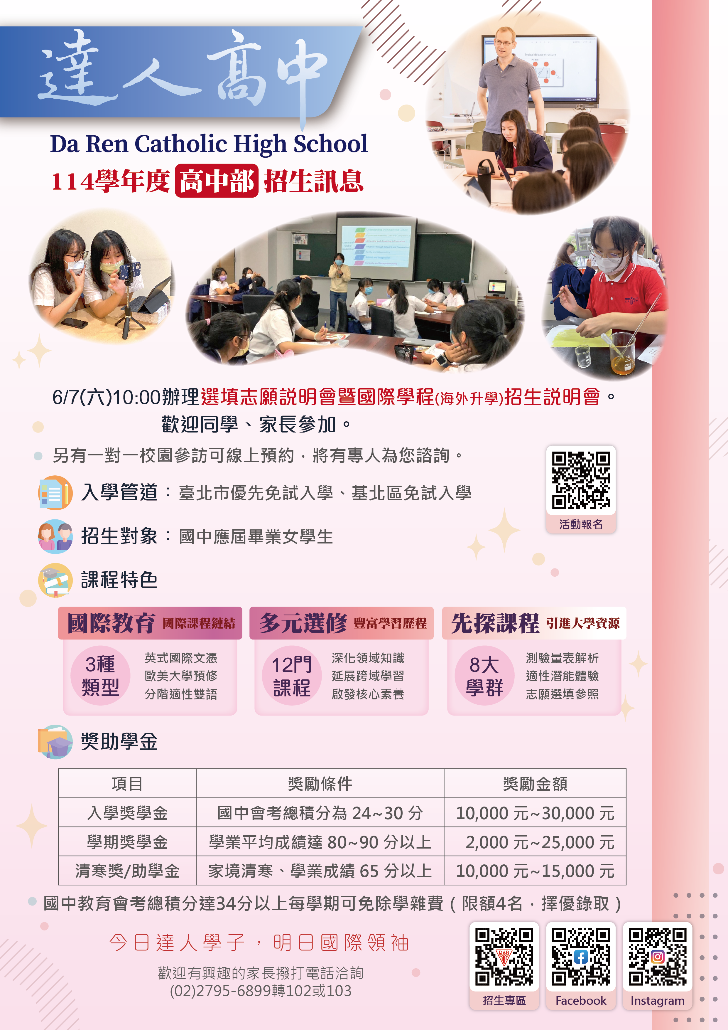 三、達人高中訂於6月7日(星期六)上午10時辦理志願選填說明會暨國際學程(海外升學)招生說明會,歡迎九年級女學生及家長報名參加,詳見附件海報及活動報名連結。