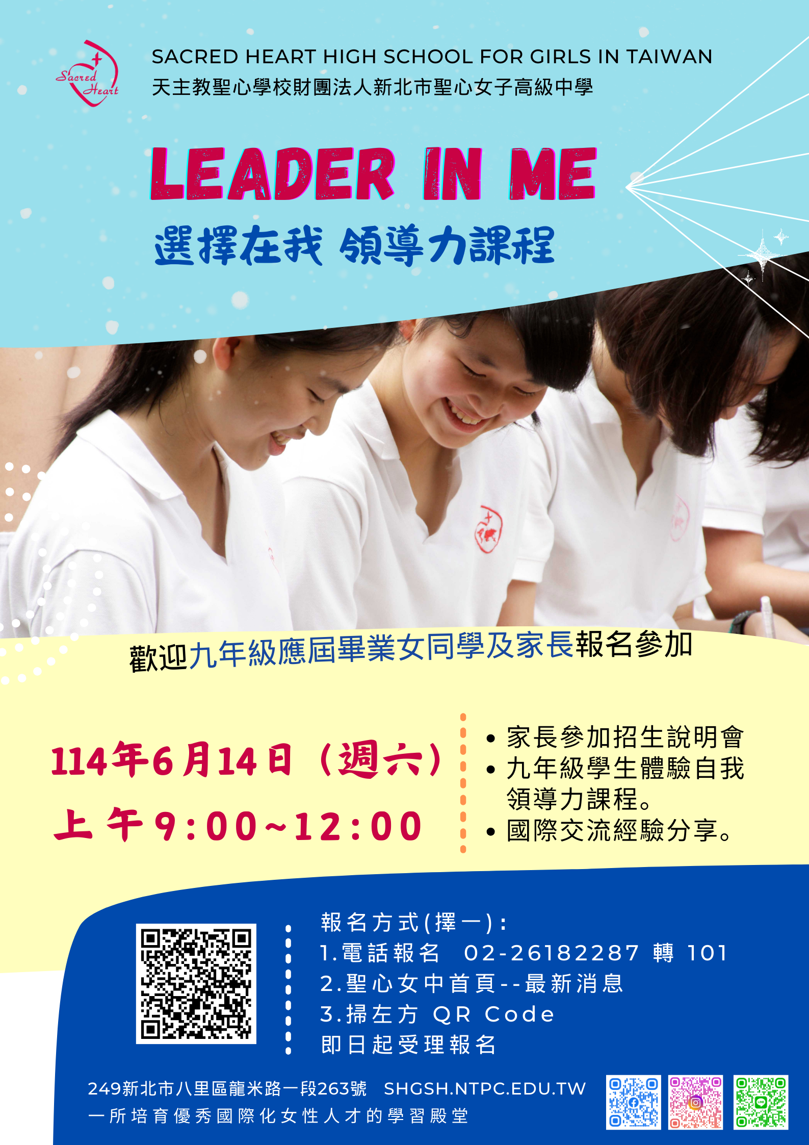 一、轉知新北市聖心女子高級中學(以下簡稱聖心女中)辦理114學年度OPEN DAY《Leader In Me》課程體驗活動,歡迎本校九年級應屆畢業女學生及家長參加。