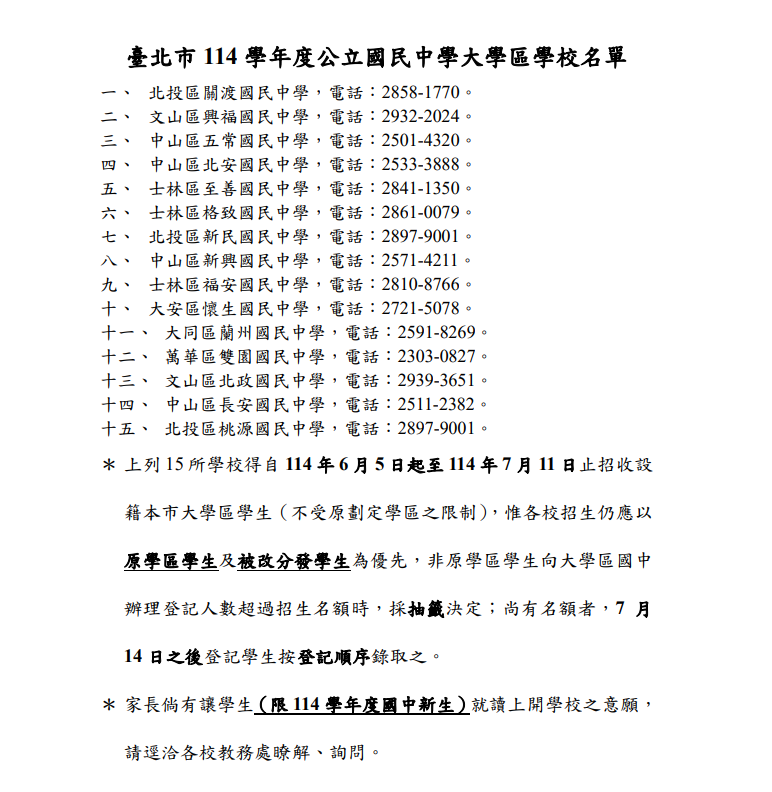 二、114學年度本市公立國民中學大學區學校共計15所,前開學 校得於114年6月5日起至114年7月11日止招收設籍本市學生 (不受原劃定學區限制),惟各校招生仍應以原學區學生 及被改分發學生為優先,非原學區學生向大學區國中辦理 登記人數超過招生名額時,採抽籤方式決定。