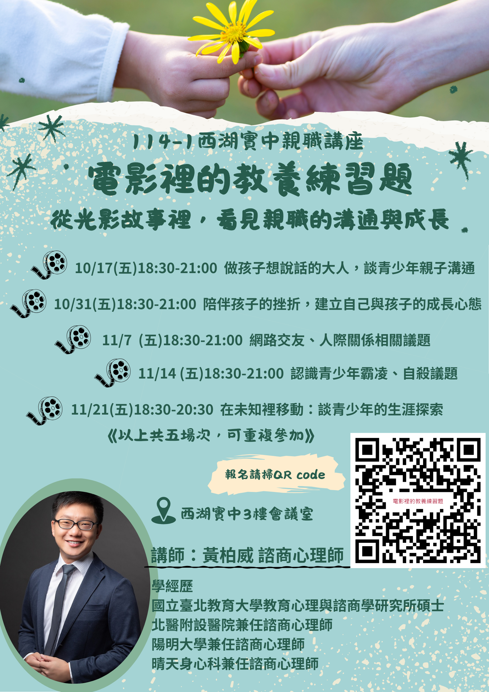 主旨:轉知臺北市西湖實驗國民中學辦理114學年度第一學期親職講座:電影裡的教養練習題-「從光影故事裡,看見親職的溝通與成長」工作坊研習資料,歡迎本校教師及家長報名參加。