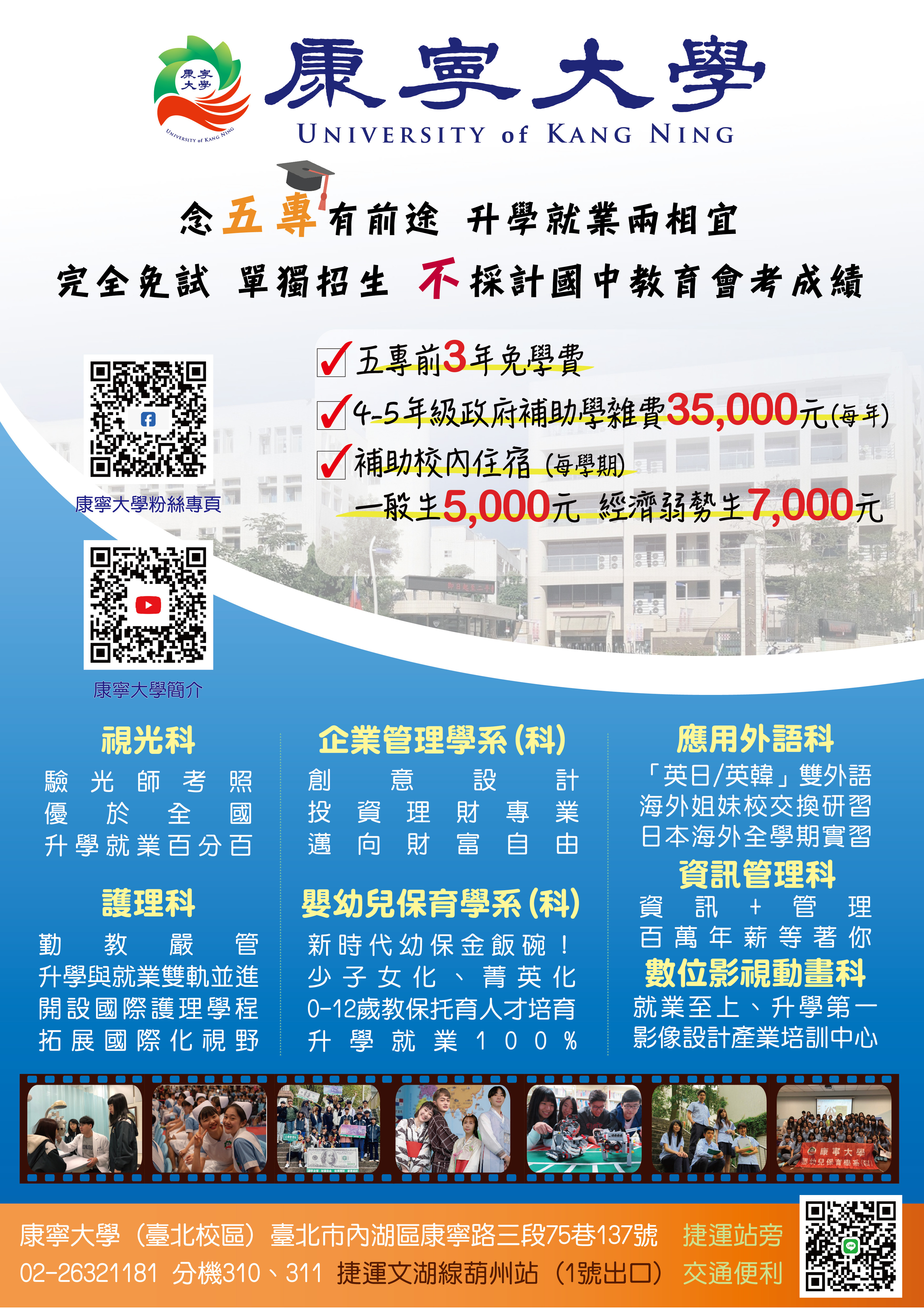 二、康寧大學五年制專科班計有:護理科、視光科、嬰幼兒保育科、應用外語科、資訊管理科、企業管理科及數位影視動畫科,詳見附件招生海報及招生影片。