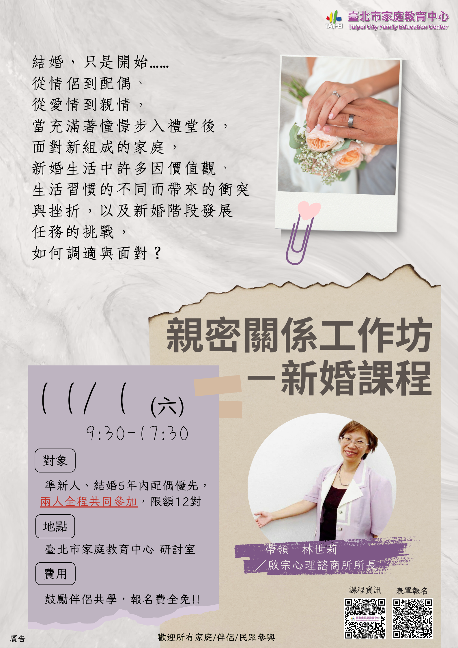 一、轉知本市家庭教育中心辦理「親密關係工作坊-新婚課程」訊息。