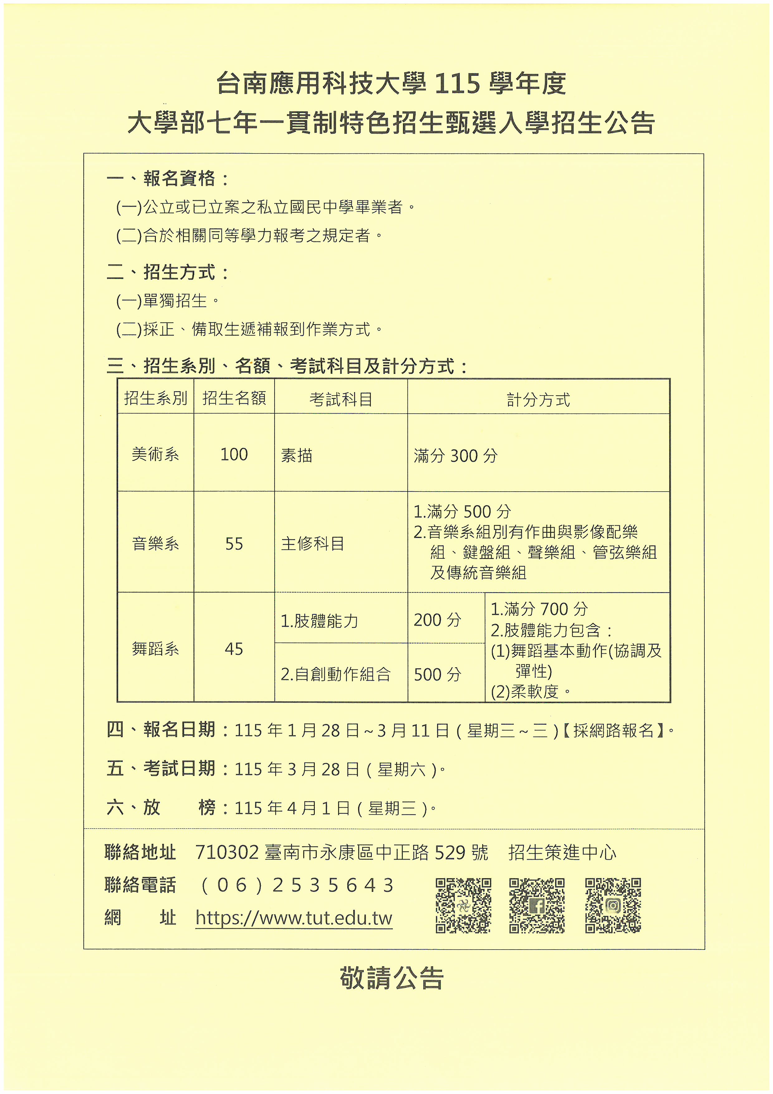 一、轉知台南應用科技大學115學年度大學部七年一貫制特色招生甄選入學招生訊息。